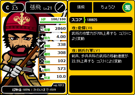 コスト2.5の張飛だと、Lv6の豪傑は70%の攻撃力UP。