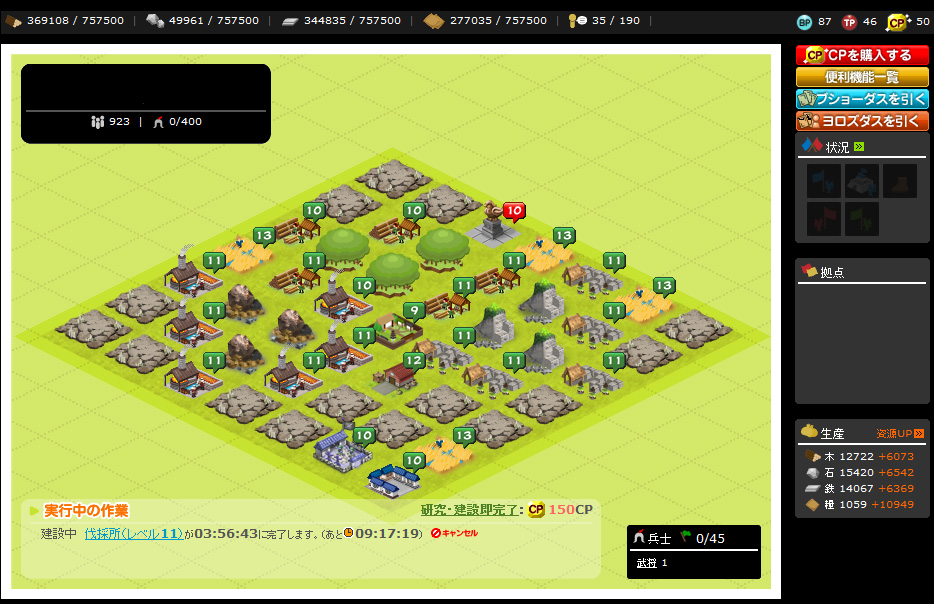 村施設のLvは9なので、9%の生産ボーナスを得ています。