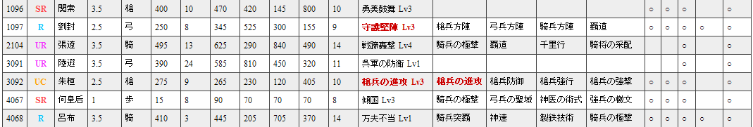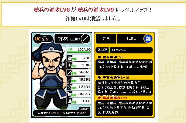 Lv9 槍兵、矛槍兵、槍兵兵科の武将の攻撃力が(コスト×12.5)%上昇する 自動で発動 コストにより変動